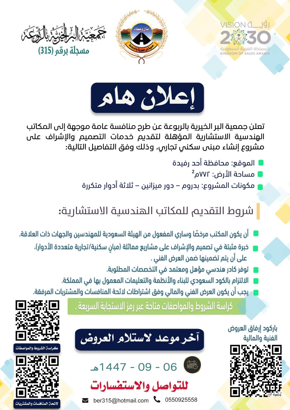 خبرة مثبتة في تصميم والإشراف على مشاريع مماثلة (مبانٍ سكنية/تجارية متعددة الأدوار)،
